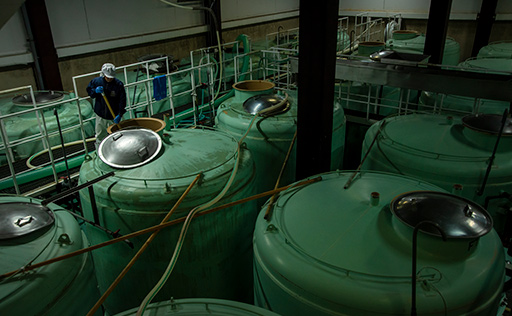 タンクに麹、酒母、蒸米を投入します。櫂棒で様子を見ながら、一カ月間低温発酵させます。
