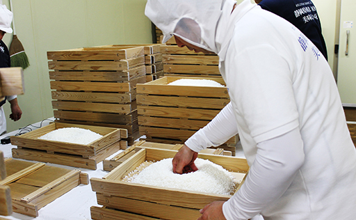 蒸米に種麹を振り、麹蓋と呼ばれる容器に麹(麹菌をまとった蒸米)を移し、ここで発育を待ちます。均一に空気がいきわたり温度管理されるよう、朝夕問わず蔵人が手入れします。